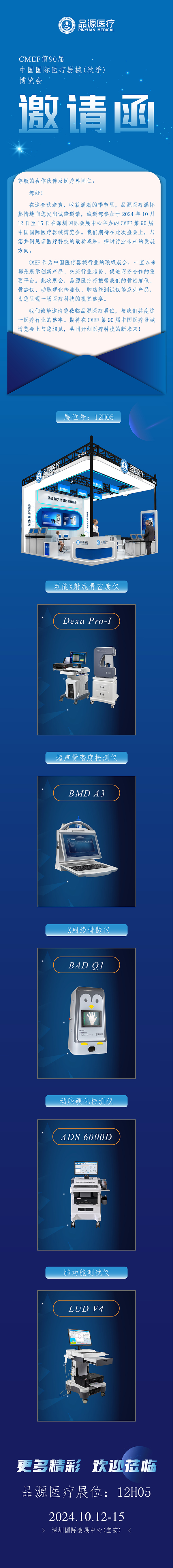CMEF 作為中國醫(yī)療器械行業(yè)的頂級展會,一直以來都是展示創(chuàng)新產(chǎn)品、交流行業(yè)趨勢、促進商務合作的重要平臺。此次展會,品源醫(yī)療將攜帶我們的骨密度儀、骨齡儀、動脈硬化檢測儀、肺功能測試儀等系列產(chǎn)品,為您呈現(xiàn)一場醫(yī)療科技的視覺盛宴。我們誠摯邀請您蒞臨品源醫(yī)療展位12H05,與我們共度這一醫(yī)療行業(yè)的盛事。期待在 CMEF 第 90 屆中國醫(yī)療器械博覽會上與您相見,共同開創(chuàng)醫(yī)療科技的新未來!