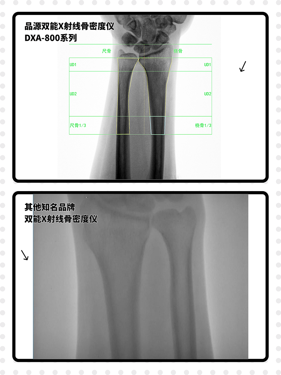 針對臨床常見的前臂骨密度檢測場景,雙能X射線骨密度儀DXA-800E特別搭載非均勻性校正(NUC)算法,專門對前臂圖像進行優化處理。